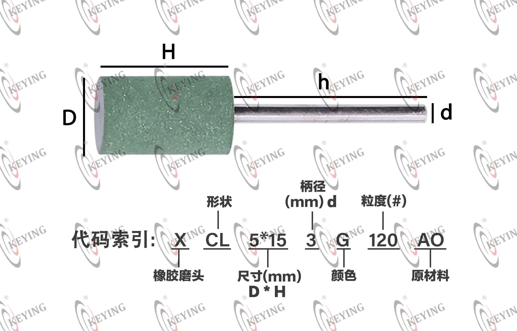 | 品牌 | KEYING科盈 | 形状 | 圆柱形 | 产品 编码 | X + CL + 30*25 + 6 + G + 120 ↓ ↓ ↓ ↓ ↓ ↓ 橡胶磨头 形状 尺寸(mm) D*H 柄径(mm) d 颜色 粒度(#) |