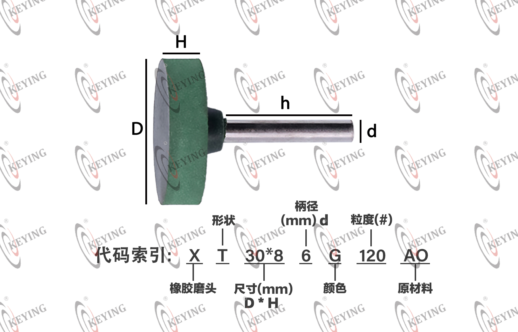 | 品牌 | KEYING科盈 | 形状 | T型 | 产品 编码 | X + T + 40*10 + 6 + G + 120 ↓ ↓ ↓ ↓ ↓ ↓ 橡胶磨头 形状 尺寸(mm) D*H 柄径(mm) d 颜色 粒度(#) |