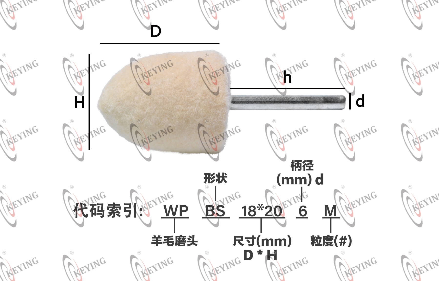 WP + BS + 12*18 + 3 + M ↓ ↓ ↓ ↓ ↓ 羊毛磨头 圆锥形 尺寸(mm) D * H 柄径(mm) d 粒度(#)