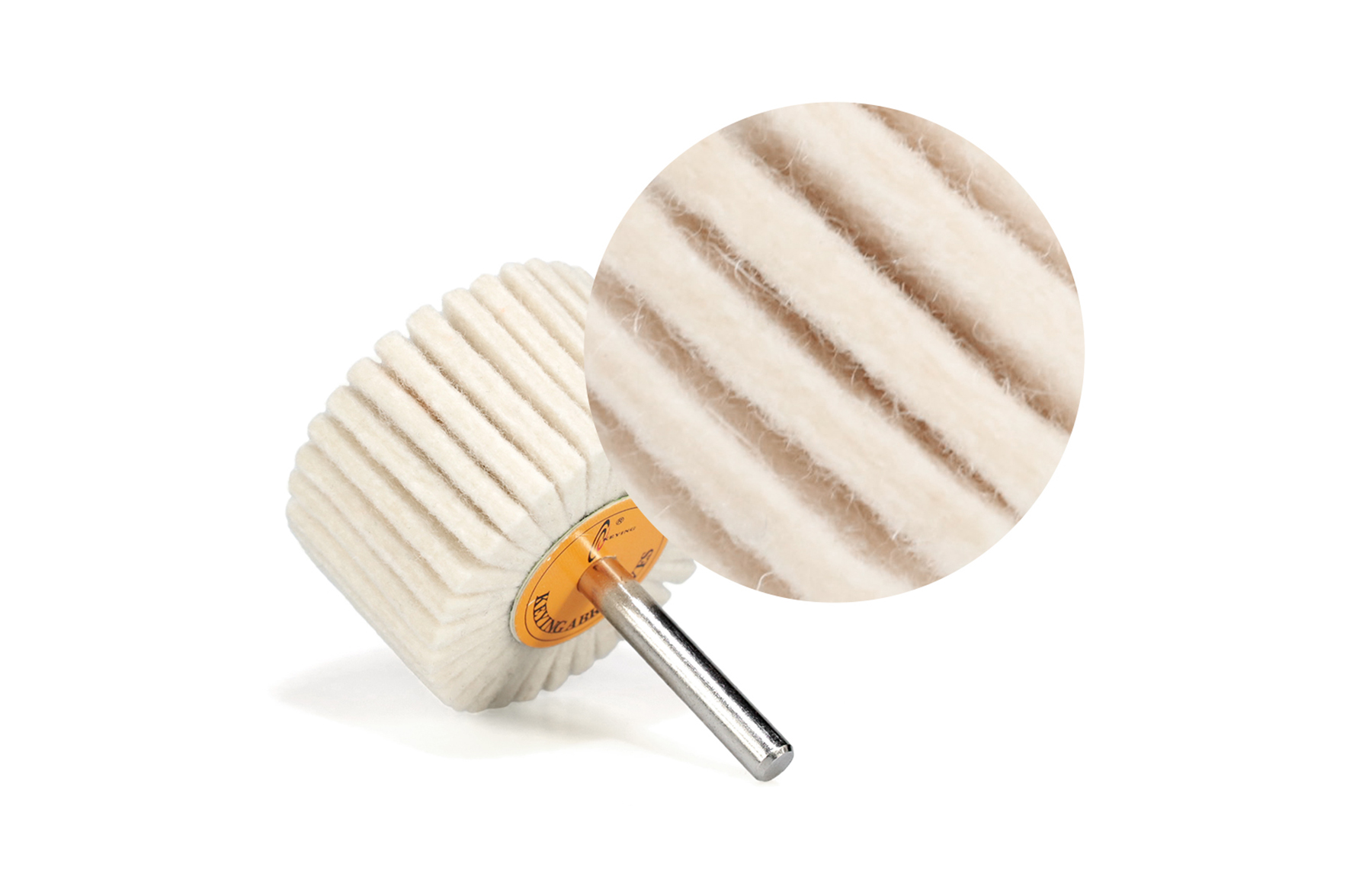 KEYING科盈羊毛页轮结合抛光膏用于预抛光和高光抛光,可以在难以触及的地方精确的工作。最主要的用途是对硬质类型的工件进行预抛光处理,对软质类型的工件进行高光泽抛光处理,对所有工件进行抛光收尾工作,如果需要非常精细的镜面效果,可以选择配合研磨膏进行多次反复抛光。