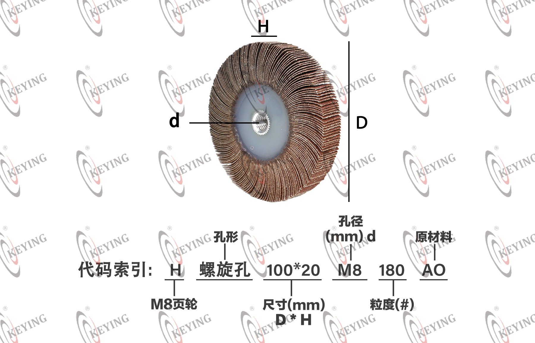 H + 螺旋孔 + 125*20 + M8 + 180 + AO ↓ ↓ ↓ ↓ ↓ ↓ M8页轮   孔形 尺寸(mm) D * H 孔径(mm) d 粒度(#) 原材料
