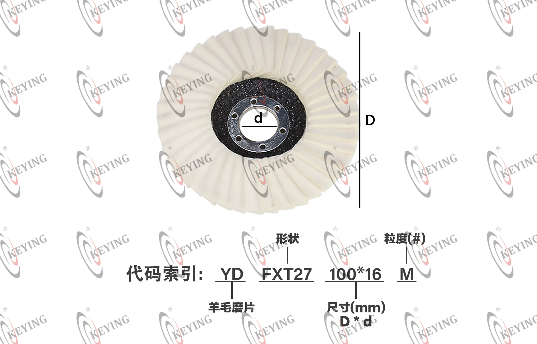 | 品牌 | KEYING科盈 | 原产国 | 中国 | 产品 编码 | YD + FXT27 + 100*16 + M ↓ ↓ ↓ ↓ 羊毛磨片 形状 尺寸(mm) D * d 粒度(#) |