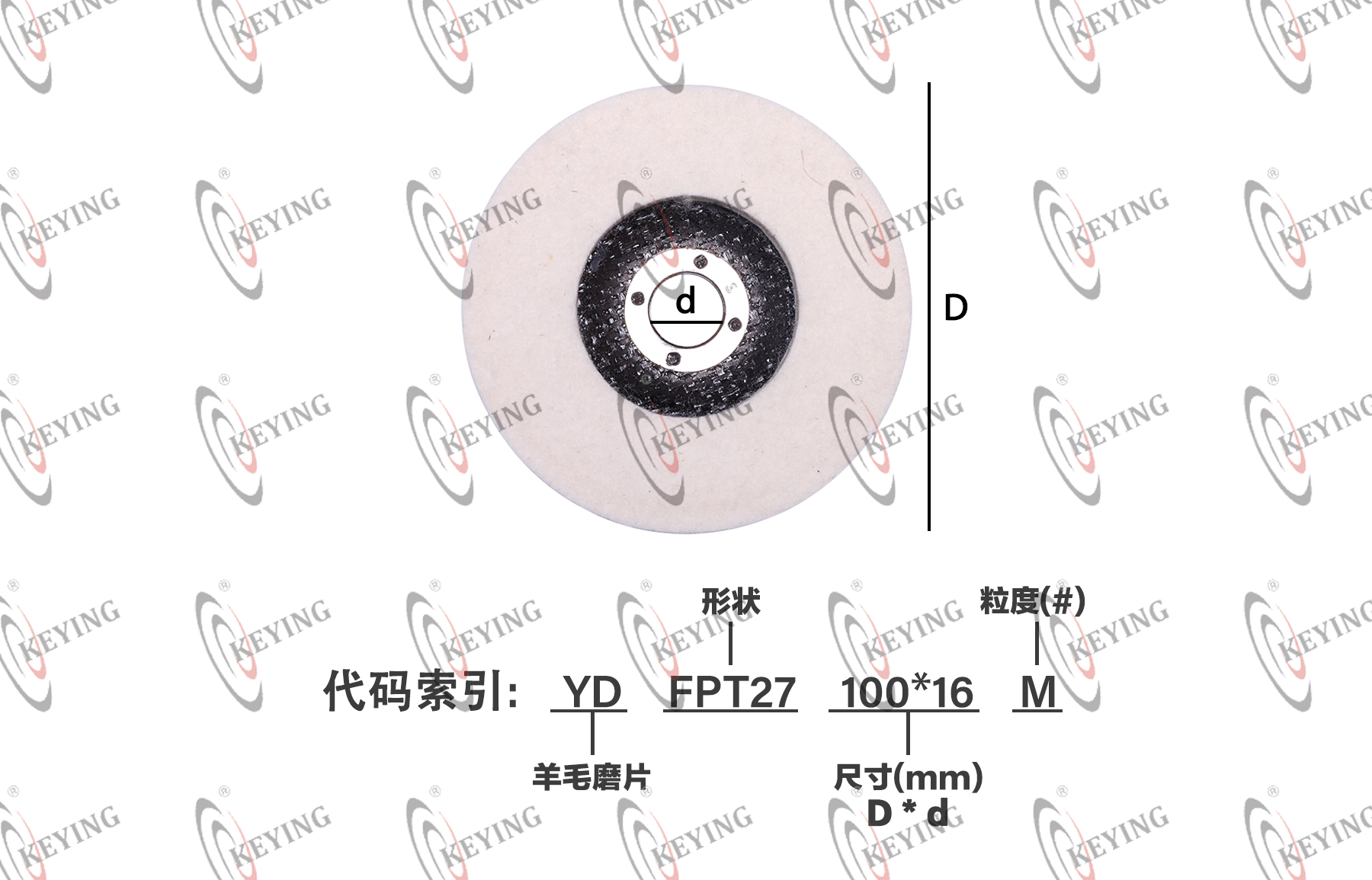 | 品牌 | KEYING科盈 | 原产国 | 中国 | 产品 编码 | YD + FPT27 + 100*16 + M ↓ ↓ ↓ ↓ 羊毛磨片 形状 尺寸(mm) D * d 粒度(#) |