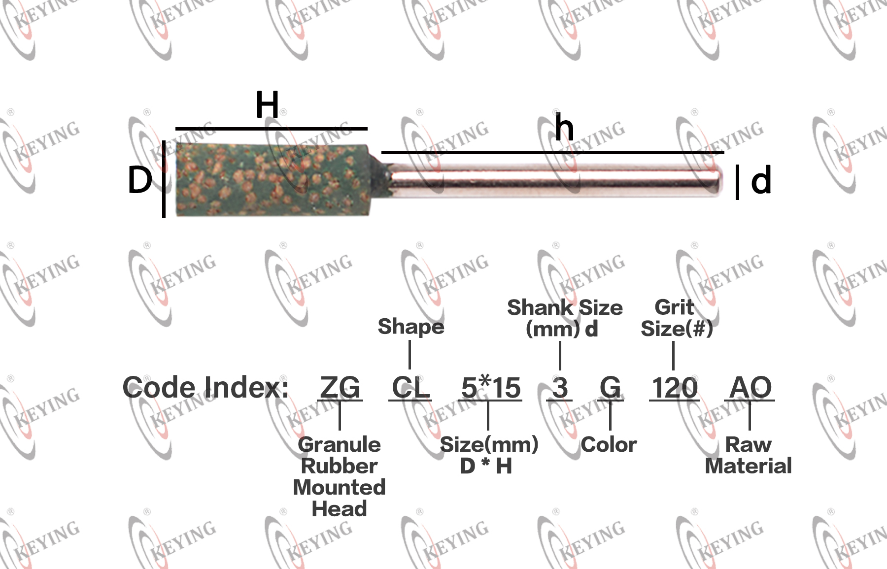 | Brand | KEYING | Shape | Cylindrical | Product Code | ZG + CL + 8*20*3 + G + 120 ↓ ↓ ↓ ↓ ↓ Granule Rubber Mounted Head Shape Size(mm) D*H*d Color Grit(#) |