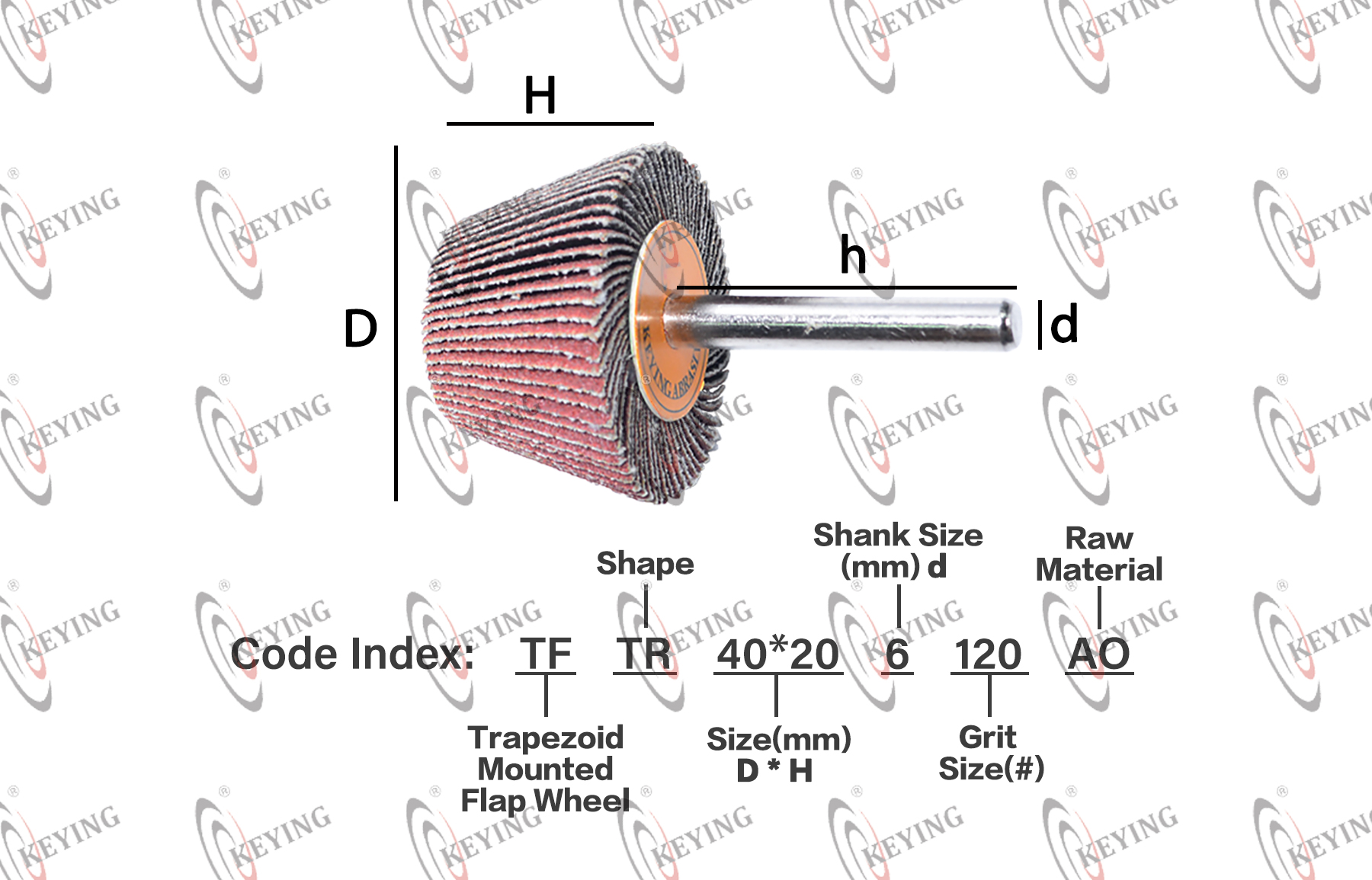 | Brand | KEYING | Origin Country | China | Product Code | TF + 25*20*6 + 120 + AO ↓ ↓ ↓ ↓ <span style="color:#555555;font-family:微软雅黑, " text-align:center;white-space:normal;background-color:#f5f5f5;"="">Trapezoide Mounted Flap Wheel Size(mm) D * H * d Grit(#) Raw Material |