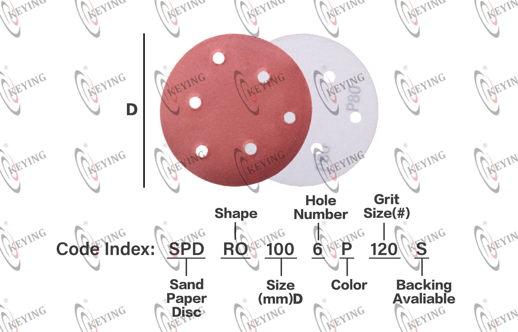 | Product Code | SPD + RO + 100 + 17 + P + 120 + S ↓ ↓ ↓ ↓ ↓ ↓ ↓ Sand Paper Disc Shape Size(mm) Hole Numble Color Grit Backing Avaliable | ||
