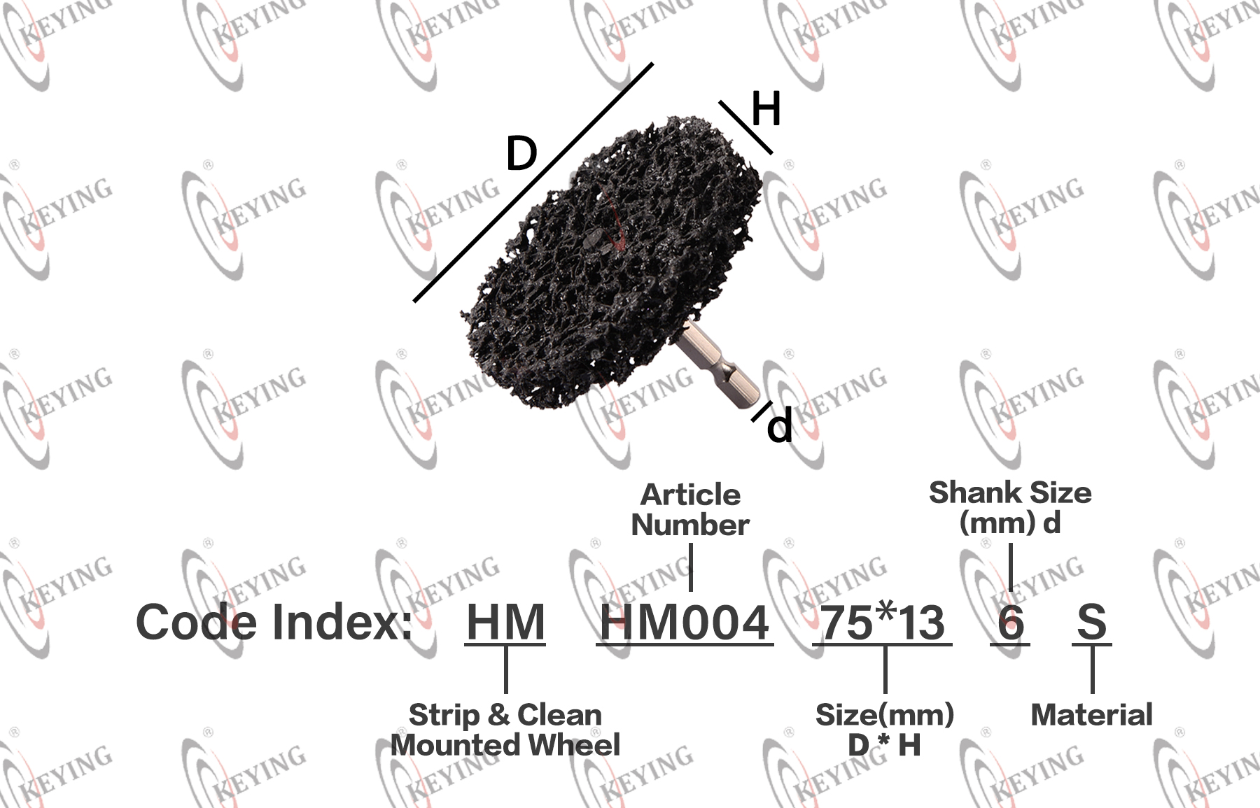 | Product Code | HM + HM004 + 75*13*6 + S ↓ ↓ ↓ ↓ Strip & Clean Mounted Wheel Article Numble Size D*H*d (mm) Raw Material | ||