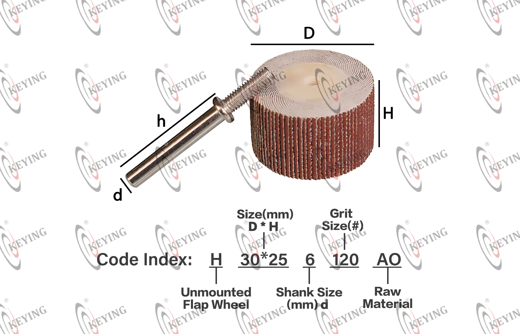 | Product Code | H + 8*8 + 3 + 320 + AO ↓ ↓ ↓ ↓ ↓ Umounted Flap Wheel Size(mm) D * H Shank Diameter(mm) d Grit(#) Raw Material | ||||
