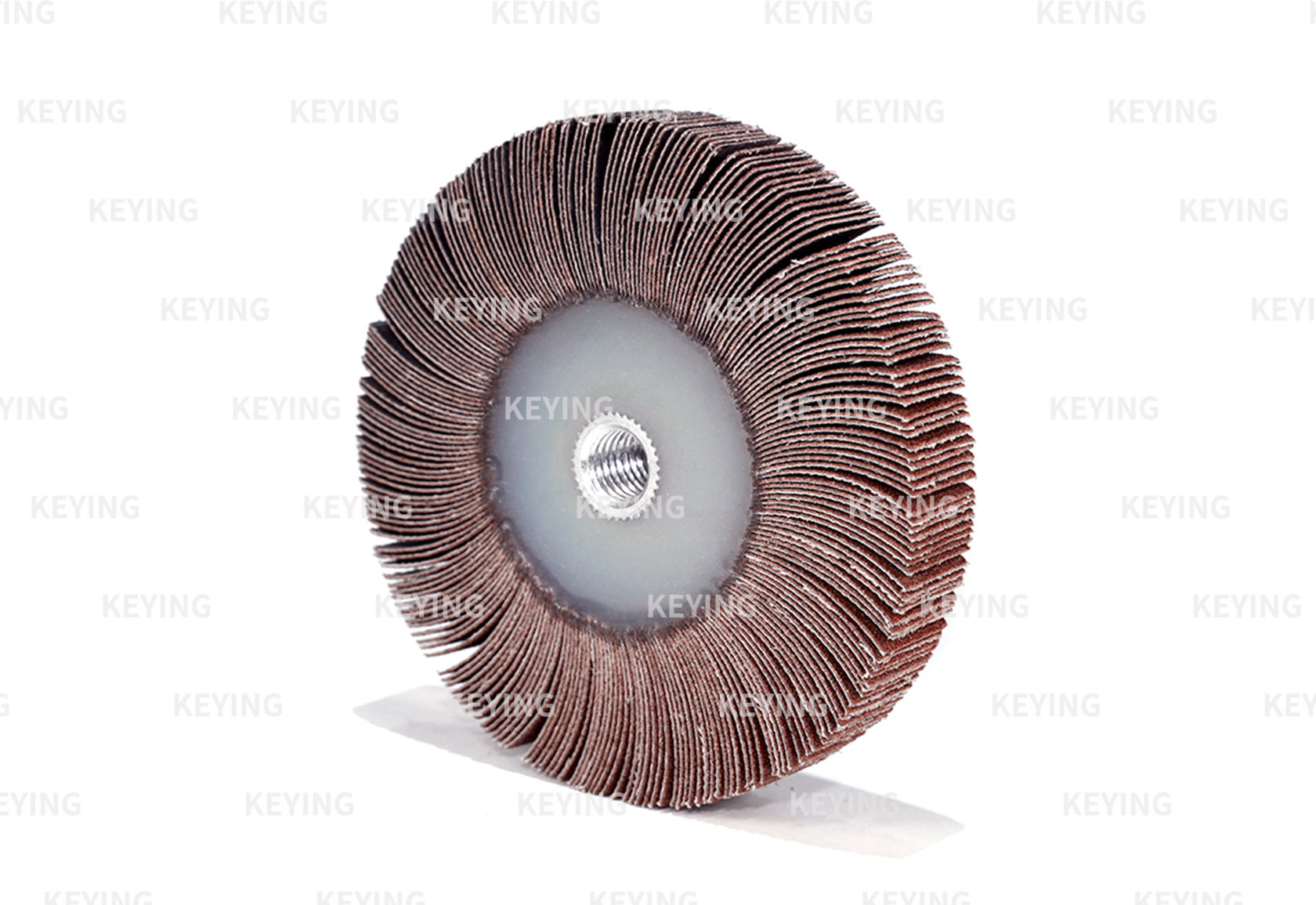 The model of this non-standard customized Flap wheel is M14 Screw Hole Type, the middle hole is 14mm screw hole. The middle of the Flap wheel is made of imported high-quality special glue, and the middle hole is made of thread. KEYING Flap wheel with Shank is a consumable industrial product of polishing and grinding head series in China abrasive and abrasive market, which is a kind of machining accessories. KEYING considers that due to the different use and particularity of the workpiece in industrial processing, the conventional type of Flap wheel with Shank cannot be satisfied, so we support sample processing and map processing. In order to improve the application ability of Mounted Flap wheel in processing, customized for customers.