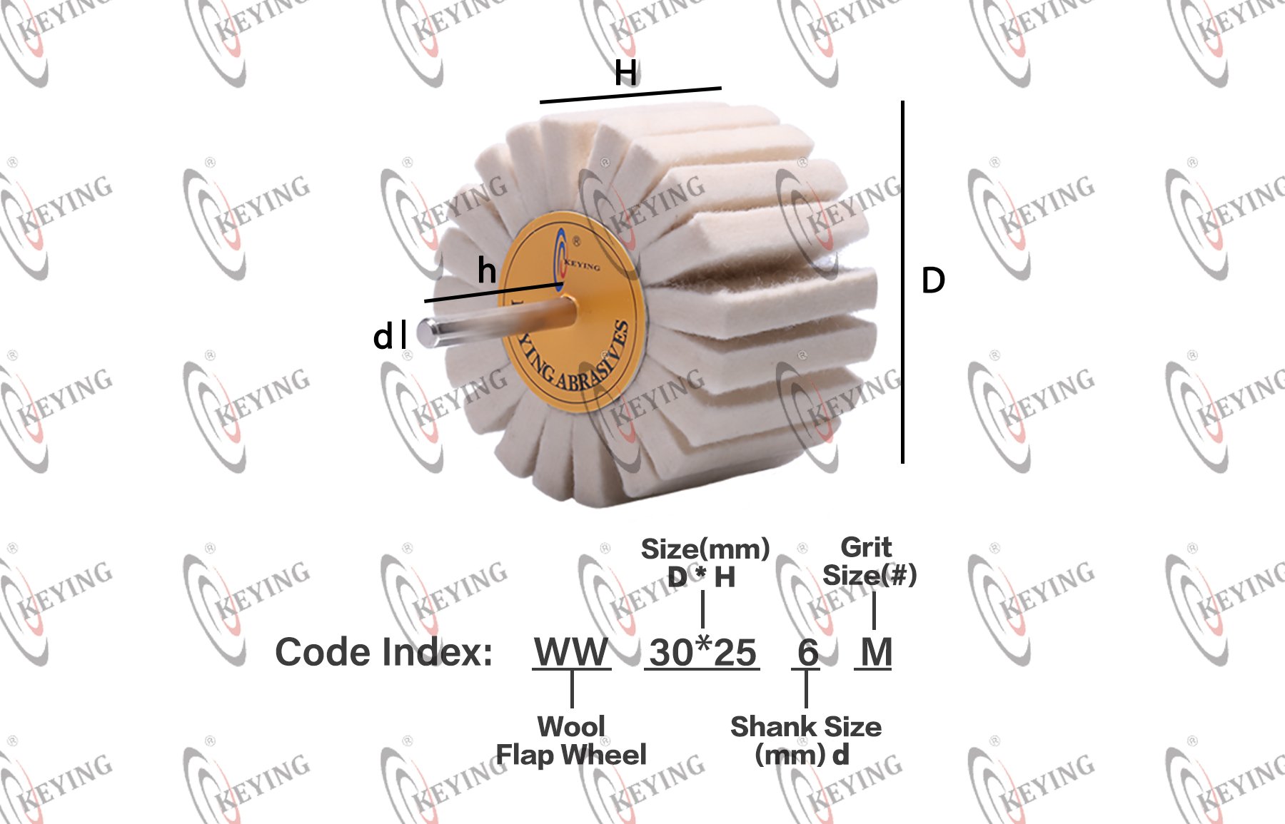 | Brand | KEYING | Orgin Country | China | Product Code | WW + 60*30 + 6 + M ↓ ↓ ↓ ↓ Wool Felt Wheel Size(mm) D*H Shank Dia(mm) d Grit(#) |