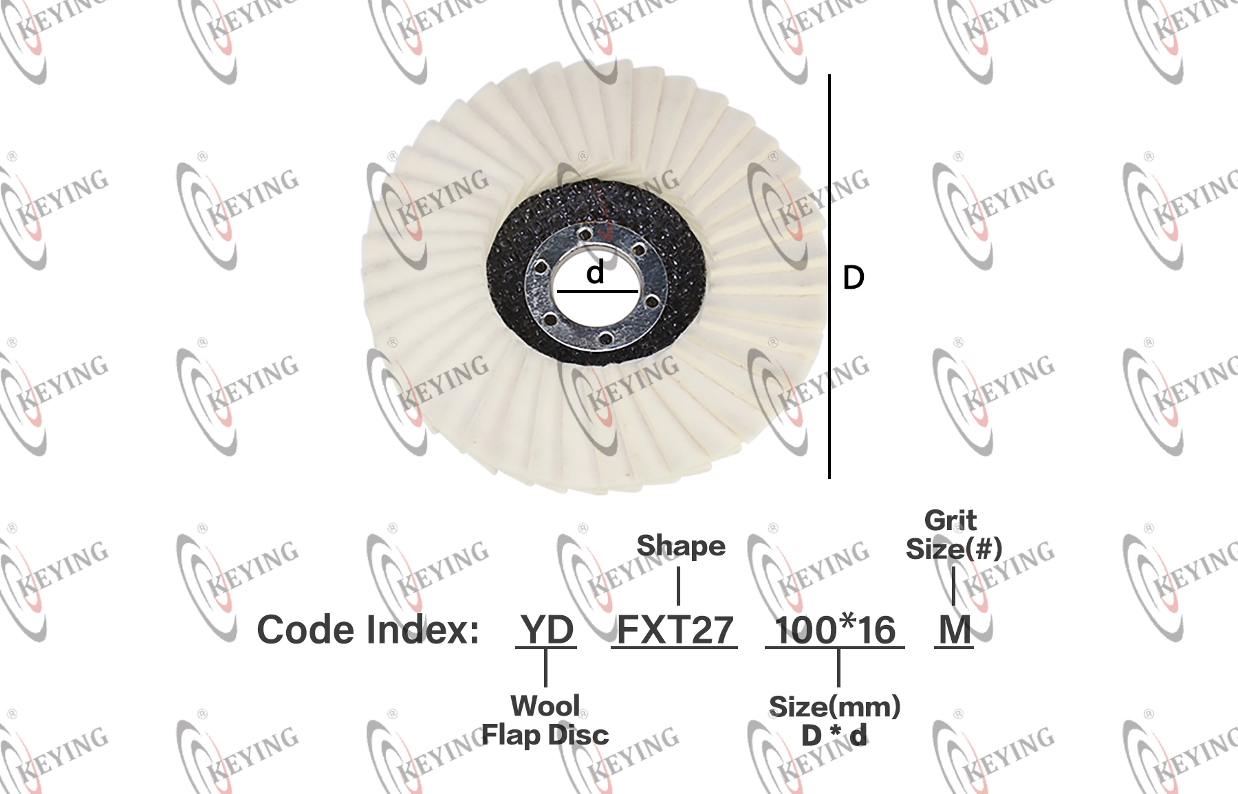 | Brand | KEYING<br< td=""> | Origin Country | China | Product Code | YD + FXT27 + 100*16 + M ↓ ↓ ↓ ↓ Wool Flap Disc Shape Size(mm) D*d Grit(#) |