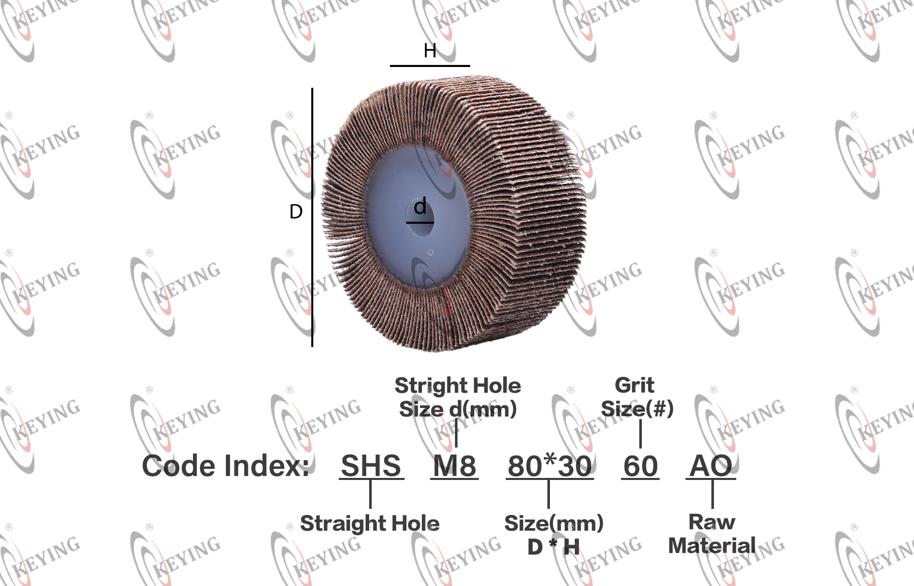 | Brand | KEYING | Origin Country | China | Product Code | SHS + M8 + 80*30 + 60 + AO ↓ ↓ ↓ ↓ ↓ Straight Hole Flap Wheel Straight Hole Type Size(mm) D * H Grit(#) Raw Material |
